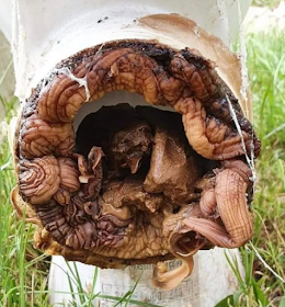 Ever since I was a child I've always felt a sense of unease sitting down on the toilet. What might come up through the hole at the bottom and grab me by my most sensitive parts? Of course this is an irrational dark fantasy... or at least it was. A story has emerged that makes me wonder what really lurks in that hidden, lightless world filled with our most repulsive waste products. Steve Ratcliffe, a plumber from Wales, was called out to unblock a toilet on a rural cattle farm. Such places are very common in Wales and some of them are so remote they have independent water supplies and sewage systems. This might explain why when he looked into the bottom of the toilet Steve found a huge and grotesque growth of something that neither he nor scientists could identify. It was definitely alive, not just a chemical or sedimentary residue. The most likely possibility is that it is a previously unknown species of fungus; or a biofilm, a symbiotic mixture of fungus and bacteria. Fungi and bacteria, unlike plants, do not need sunlight to live. They love damp and dark habitats with an abundant food source and, believe it or not, they eat animal excretions with gusto. Source: https://www.sciencetimes.com/articles/40929/20221115/giant-alien-fungi-discovered-blocked-toilet-wales.htm. Despite its alarming appearance, there is currently no evidence to suggest that this growth is in any way dangerous; or at least when Steve pulled it out it didn't go for his face. There is also no reason right now to suppose it is alien in the literal sense of the word, despite the use of that term in media headlines. It's probably just done to get the reader's attention. However, I suspect much of earth's biosphere does have an extraterrestrial origin via panspermia, see: https://hpanwo-tv.blogspot.com/2013/09/exopolitics-2013-astrobiology.html, or carried here through more directed means by intelligent alien beings. The sewage systems of civilization are a perfect place for some kinds of weird creatures to live, in secret because humans avoid contact with that world for reasons of hygiene and good taste. It is said that no city dwelling human being is ever more than ten feet away from a brown rat; but I've rarely even seen a rat. I wonder what else can be found in those pipes and septic tanks, so near, yet so far. Maybe something much unexpected!